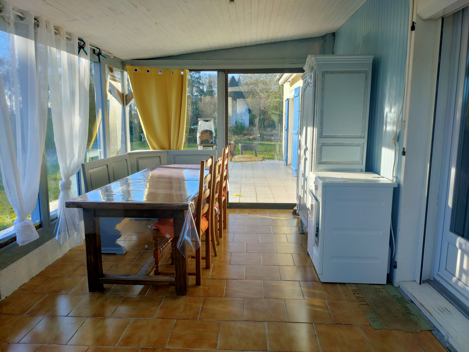 Elle se compose d'un spacieux salon/séjour avec poêle à bois, une cuisine aménagée et équipée, deux chambres dont une avec mezzanine, une salle de douches, un w/c indépendant et une véranda de 15 m².