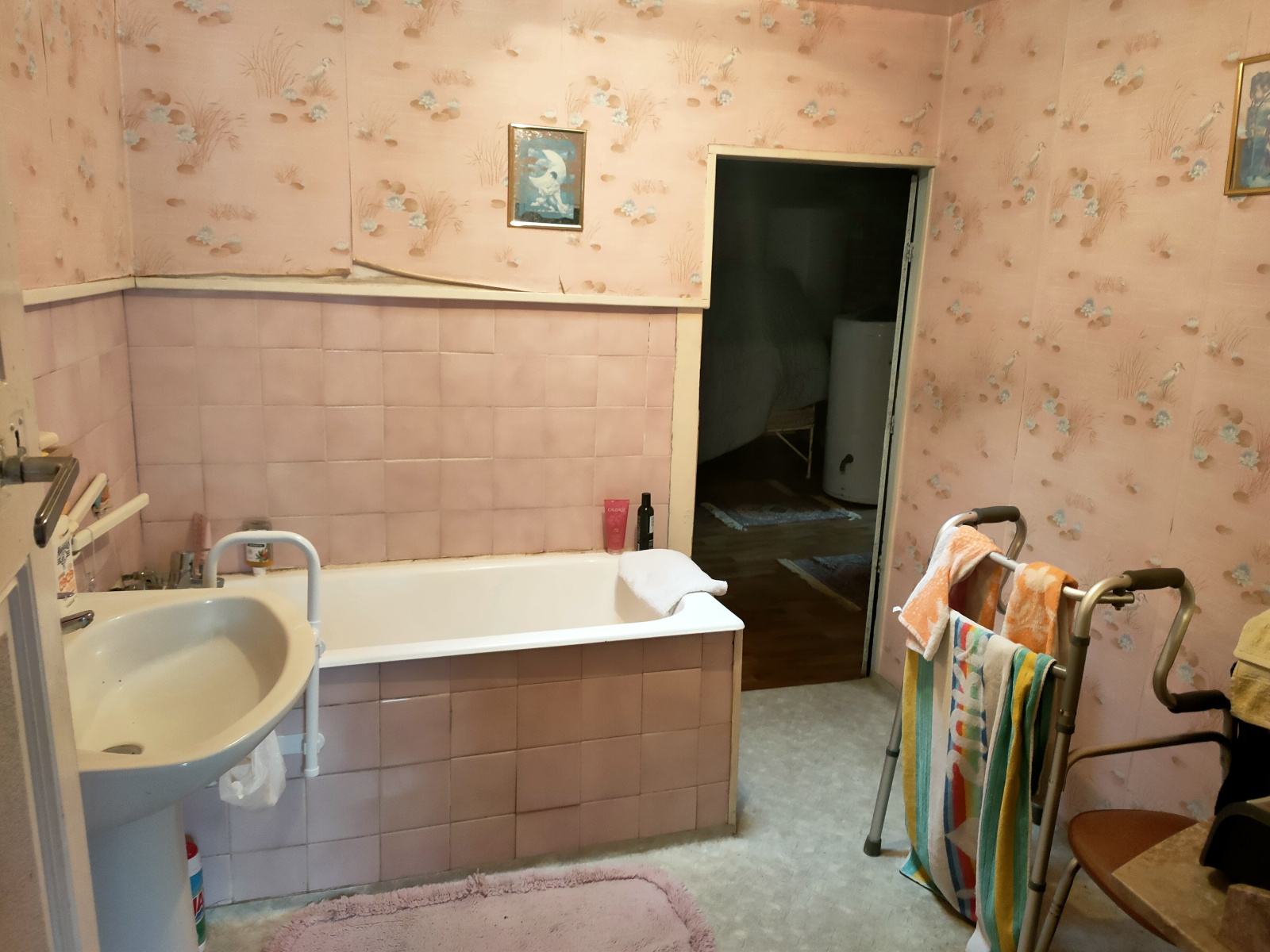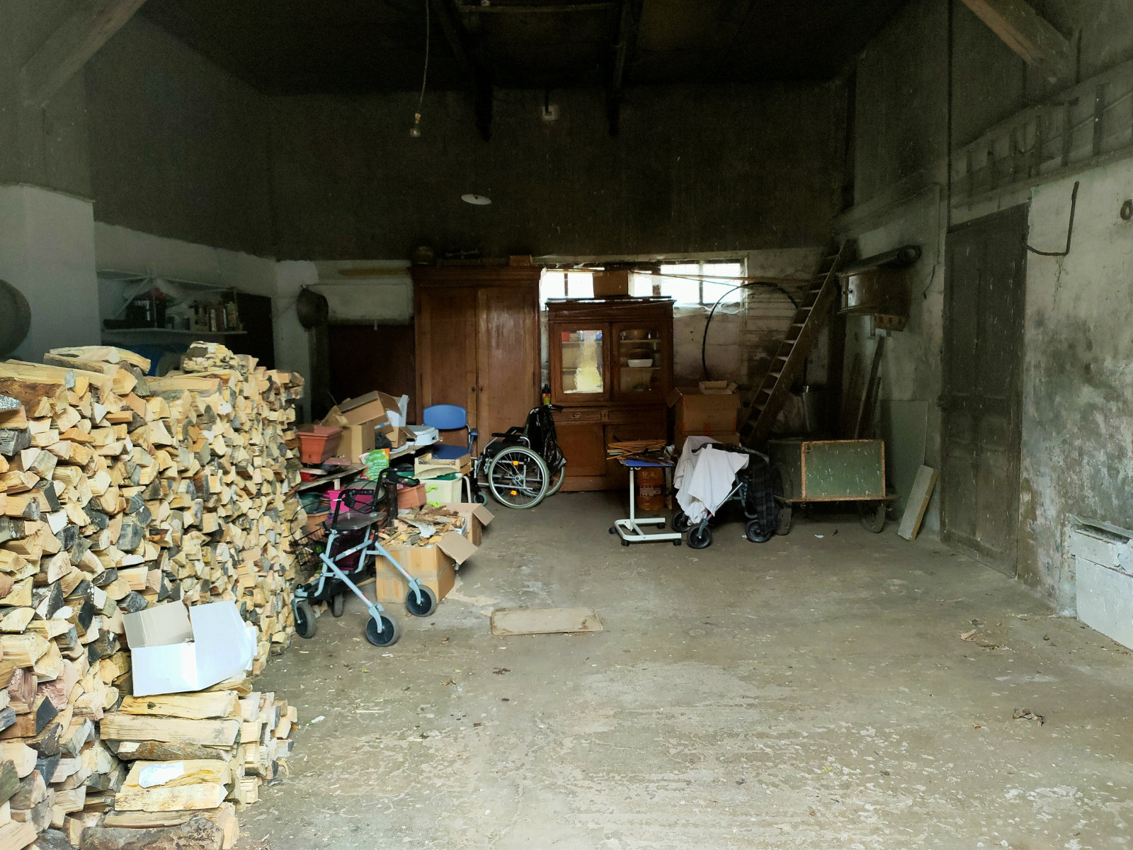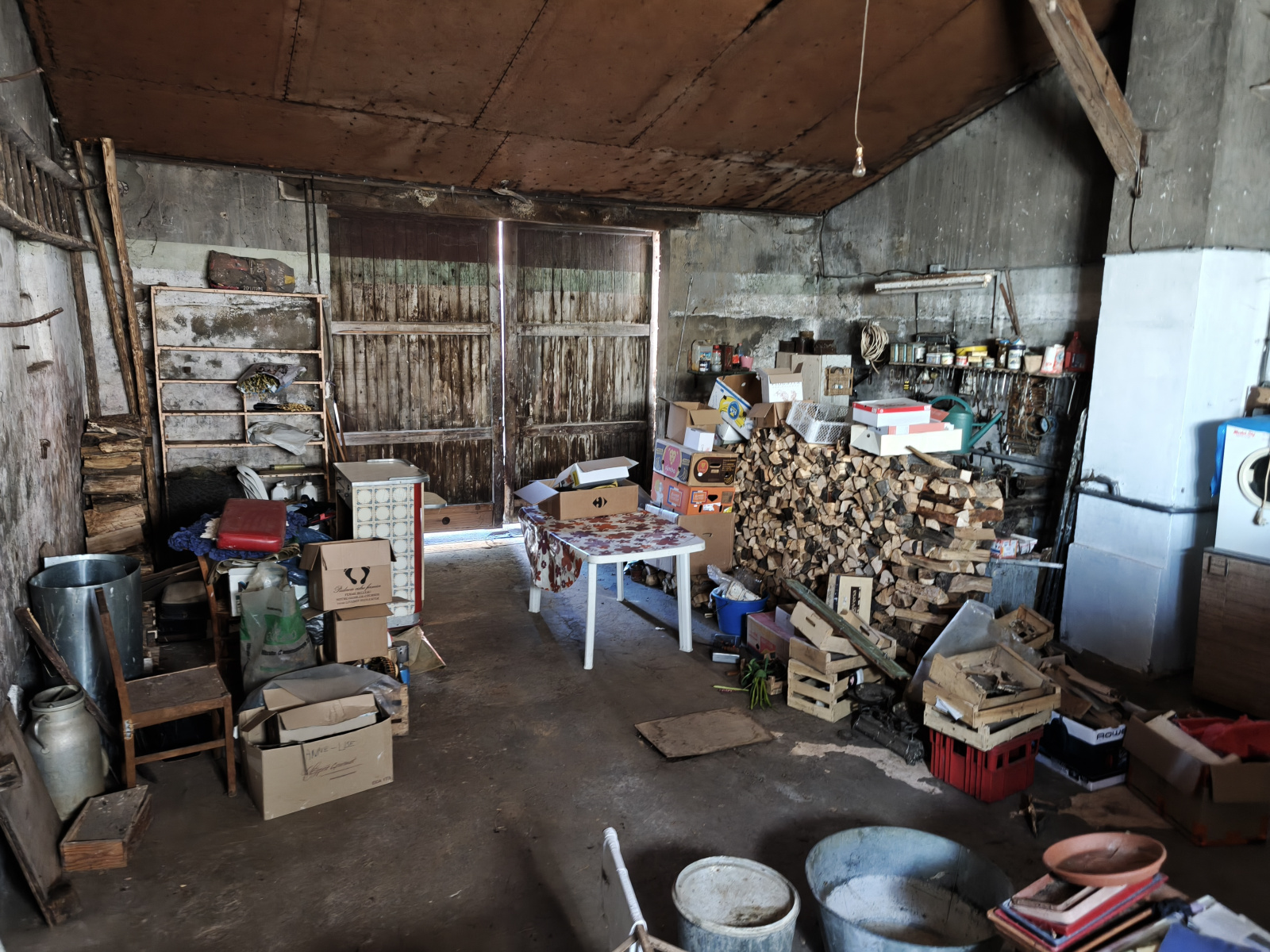 Garage de 50 m² avec deux autres pièces et un grenier de stockage communicant avec la maison.